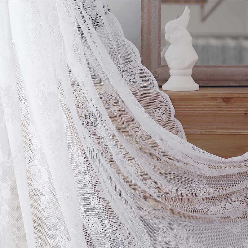 White lace curtain looks very romantic and full of french style, has solid pattern without any patterns, soft sheer flowing with wind is very beautiful.